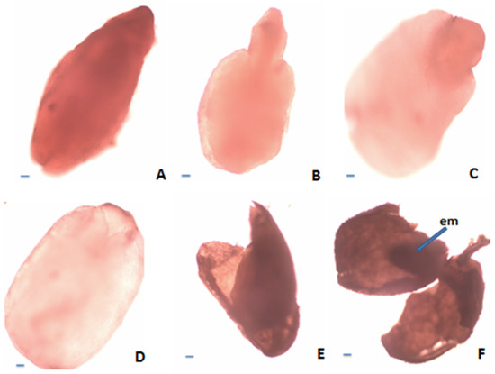 Estimation of nutlet (seed) viability according to tetrazolium test: (A)—Viable embryo (stained in dark red); (B)—Viable embryo (stained in pink); (C)—Viable embryo (only the root stained in red); (D)—Nonviable embryo (unstained); (E)—Empty seed; (F)—Seed with undeveloped embryo. Scale bar = 100 μm.