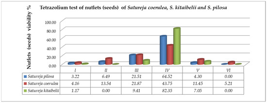According to the requirements of tetrazolium methods (TTZ test) [37,38], the seeds of S. coerulea, S. kitaibelii and S. pilosa were divided into six classes (Figure 4). The first class (Class I) included the seeds with embryos stained in dark red (Figure 4A). The second class (Class II) included the seeds with pink colored embryos (Figure 4B). The third class (Class III) included the seeds with embryos in which only the root was stained in red (Figure 4C). The fourth class (Class IV) included the seeds with colorless embryos (Figure 4D). The fifth class (Class V) comprised the empty seeds (Figure 4E). The sixth class (Class VI) included the seeds with undeveloped (dried) embryos (Figure 4F). According to Moore’s classification [39], the seeds in Classes I, II and III were considered as viable, and those in Classes IV, V and VI were considered unviable. Therefore, the amount of viable seeds (embryos) estimated in % was as follows: S. pilosa: 31.18%, S. coerulea: 39.58%, S. kitaibelii: 10.58% (Figure 5).
