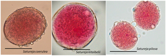 Viable pollen of Satureja coerulea, S. kitaibelii and S. pilosa. The photos were taken with LM Motic DMA (×40); Scale bar = 100 µm.