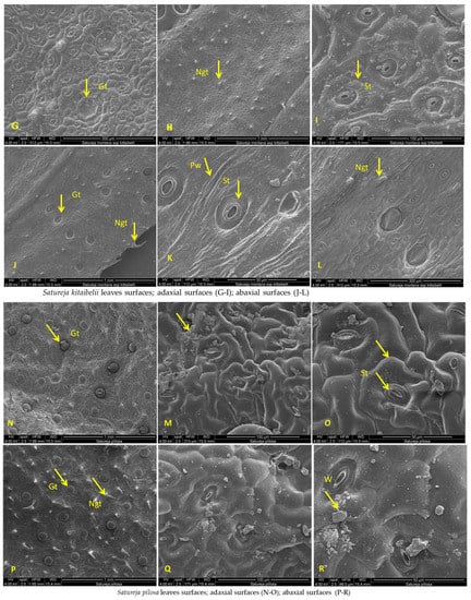 SEM analysis of leaf surfaces of Satureja coerulea (A–F), S. kitaibelii (G–L), S. pilosa (M–R); St—stomata; Gt—glandular trichomes; Ngt—non-glandular trichomes; W—waxes; Pw—periclinal wall; Str—striation.
