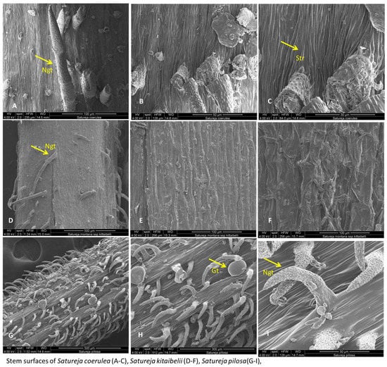 SEM analysis of stem surfaces of Satureja coerulea (A–C), S. kitaibelii (D–F), S. pilosa (G–I). Gt—glandular trichomes; Ngt—non-glandular trichomes; Str- striation.