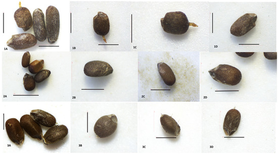 Nutlets (seeds) of Satureja species viewed with Stereo Microscope Motic DM 143. Satureja coerulea (1A–1D): (A)—view of nutlets from all sides, top, lateral, and tip; (B–D)—papillae; (C)—unevenly triangular tip; (D)—adaxial surfaces, papillae; Satureja kitaibelii (2A–2D): A—view of nutlets from all sides top, lateral, and tip; (B–D)—lateral view, the triangular tip; Satureja pilosa 10; (3A–3D): A—view of nutlets from all sides top, lateral, and tip; (B–D)—papillae, unevenly triangular tip. Scale bar = 100 µm.
