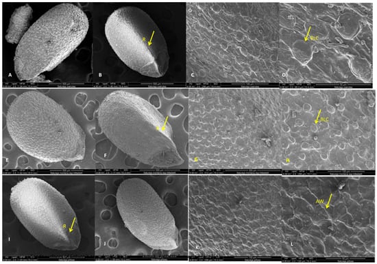 SEM analysis of nutlet surfaces of Satureja coerulea, S. kitaibelii, and S. pilosa; (A,E,I)—the general view; (B,F,J)—triangular edge; (C,D,G,H,K,L)—surfaces. BLC—bubble like cells; R—rib; AW—anticlinal walls.