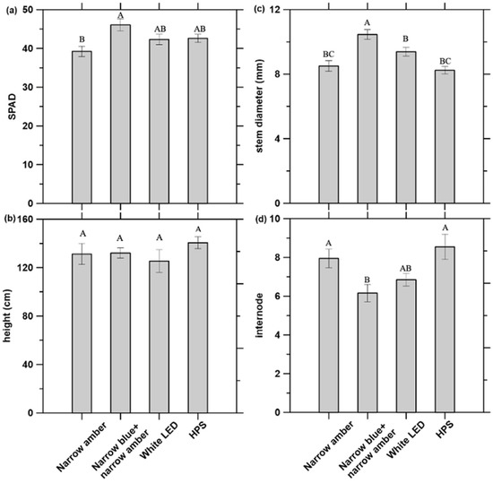 Figure 1. Effect of the different experimental light treatments on tomato plant growth (n = 6): (a) chlorophyll content (SPAD values), (b) height (cm), (c) stem diameter (mm), and (d) number of internodes. Bars with different letters represent significant differences using Tukey’s post hoc test. LED: light emitting diode; HPS: high-pressure sodium.