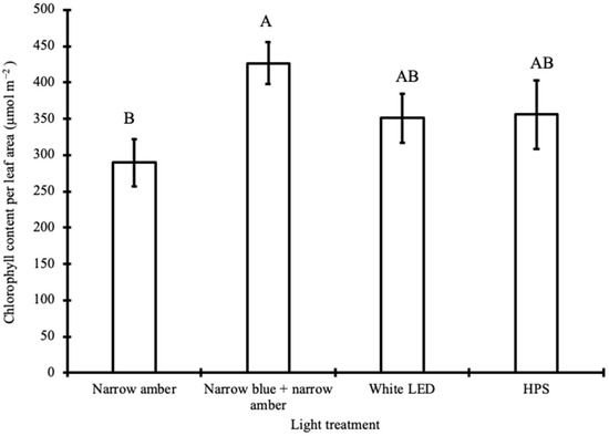 Figure 2. Chlorophyll content per leaf area (µmol m−2) measured for tomato plants under the different light treatments. Bars with different letters represent significant differences using Tukey’s post hoc test. LED: light-emitting diode; HPS: high-pressure sodium.
