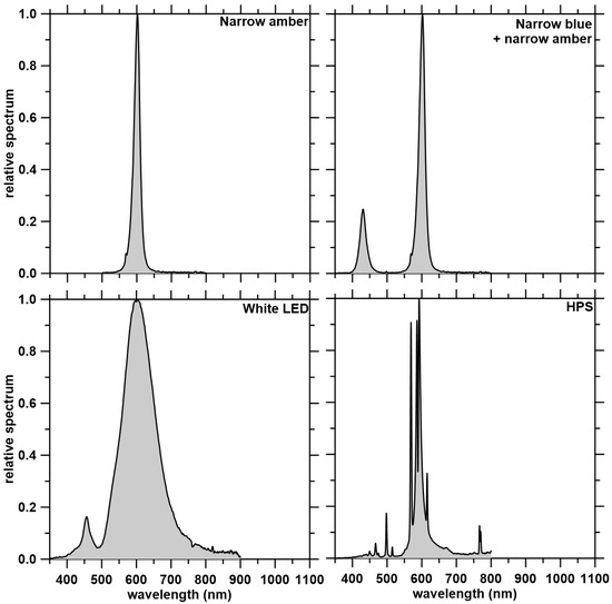 Figure 3. Relative spectra of the four experimental light treatments: narrow amber light, narrow blue + narrow amber light, white LED light, and high-pressure sodium (HPS) light (control).