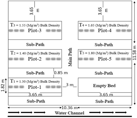 Nursery soil was loamy, having dry bulk densities around 1.3 ± 0.03 mg m−3 (Table 4). The experiment was conducted in earthen beds to reduce the risk of compaction variability. Five nursery beds (treatments) were prepared. The boundary was highlighted and marked using a rope, and then brick alignment was done. The soil was dragged to form sub-paths of 0.85 m wide and 3.65 m long along with the main central path, which was 3 m in width and 11.58 m in length. Sunken beds 3.65 m long and 1.82 m wide were made and lined with bricks. After removing stubbles and weeding, all the paths and beds were leveled. A manual soil compactor having 10 kg of weight from a 0.25 m height was continuously dropped and lifted to adjust the compaction levels of the prepared beds. A cone penetrometer fitted with a 25 mm diameter was used to check the compaction level quickly, in which the dial gauge provides a clear readout of penetration [23]. Then, the final bulk densities were measured for each bed (Table 4).