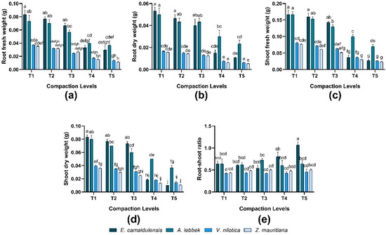 Effect of soil compaction on root and shoot weights (fresh and dry) g and root–shoot ratio (dry weights) of different agro-forest tree species (a–e). Note: Values are mean ± SE. For root and shoot (fresh and dry weights) and root–shoot ratio, there were significant differences (p < 0.05) by the different lowercase letter(s) among E. camaldulensis, A. lebbeck, V. nilotica, and Z. mauritiana in different compaction levels.
