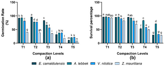 Effect of soil compaction on plant germination rate and survival percentage (%) of different agro-forest tree species (a,b). Note: Values are mean ± SE. For germination rate and survival percentage, there were significant differences (p < 0.05) by the different lowercase letter(s) among E. camaldulensis, A. lebbeck, V. nilotica, and Z. mauritiana in different compaction levels.