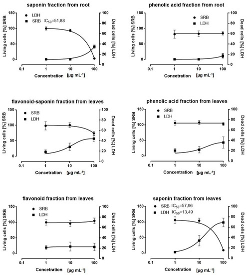 Effect of fractions from the roots and leaves of Eryngium planum L. on SKOV-3 cell viability. After 24 h treatment with fractions at the range of concentration 1–100 µg mL−1, IC50 values were determined by SRB and LDH assays. The results of three independent replicates are presented as the mean ± SEM.