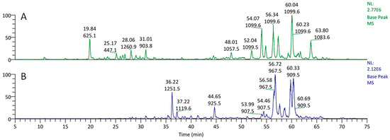 Chromatograms of methanolic fractions from (A) the rosette leaves and (B) the roots of Eryngium planum L. (values: upper—retention time; lower—molecular ion mass).