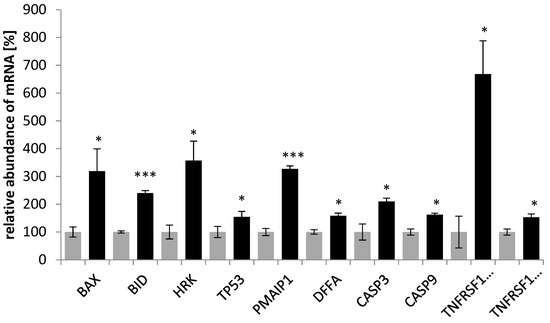 Effect of the saponin fraction from the roots of Eryngium planum L. on proapoptotic genes in the SKOV-3 cells. The PCR-array was used to analyze the level of indicated genes, treated for 24 h with the saponin fraction from the roots. The results of the three independent replicates are presented as the mean ± SEM *** p < 0.001 and * p < 0.05 compared to the control (gray—control; black—after treatment).