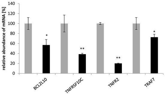 Effect of the saponin fraction from the roots of Eryngium planum L. on antiapoptotic genes in the SKOV-3 cells. The PCR-array was used to analyze the level of indicated genes, treated for 24 h with the saponin fraction from the roots. The results of the three independent replicates are presented as the mean ± SEM ** p < 0.01 and * p < 0.05 compared to the control (gray—control; black—after treatment).