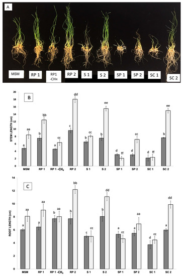 This experiment was designed to test the growth-promoting ability of the different methane-enriched communities on wheat seedlings. Wheat seeds were surface-sterilized as previously described [19] and were sown in air-tight, sealed pots. The following treatments were prepared: (1) for the control (non-inoculated), 3 mL 0.5× M9 buffer was added; (2) the RP community, derived from the rhizospheric soil from pepper plants; (3) the SP community, derived from the nonrhizospheric soil of pepper plants; (4) the SC community, derived from nonrhizospheric soil of zucchini plants; and (5) bulk soil, taken in the absence of any plants. The RC community, derived from the rhizospheric soil from zucchini plants, did not reach a significant level of absorbance; therefore, it was eliminated from further analysis. Each bacterial community was suspended to obtain 12 mL at an absorbance of 1 (660 nm) in 0.5× M9 buffer, which was then added to each pot. No additional water was added to the wheat seedlings until the end of the experiment. Pots were opened on day 6 of the assay to gather three seedling samples, with the aim of measuring the following parameters: shoot length, root length, fresh weight, and dry weight. The same experiment was conducted on day 12, with the aim of measuring the same parameters for the remaining samples [20].