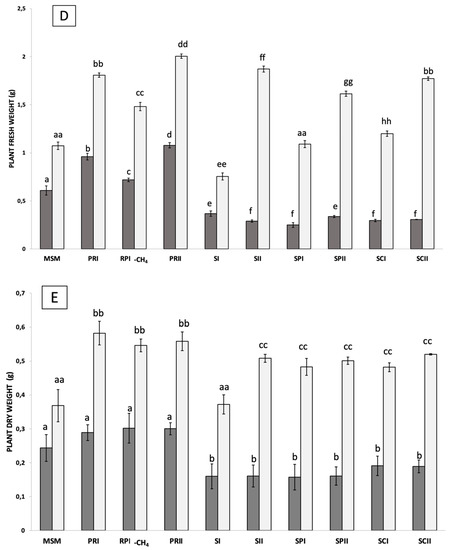 Wheat plants treated with methane-enriched communities: Appearance of the plants inoculated with the different communities of methane-oxidizing bacteria at 12 days after sowing (A). The length of the stem (B), the length of the root (C), the fresh weight (D), and the total dry weight of the plants (E) are represented for each group of plants at 6 days (represented in dark gray) and at 12 days (in light gray). Significant differences are indicated by the presence of letters, with one letter corresponding to a period of 6 days, and with two letters corresponding to a period of 12 days.