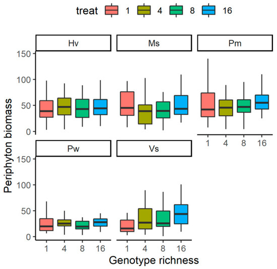 The effects of genotype richness levels on periphyton biomass growing on each species. For species name, Pw means Potamogeton wrightii; Vs means Vallisneria spinulosa; Ms means Myriophyllum spicatum; Hv means Hydrilla verticillata; Pm means P. macckianus.