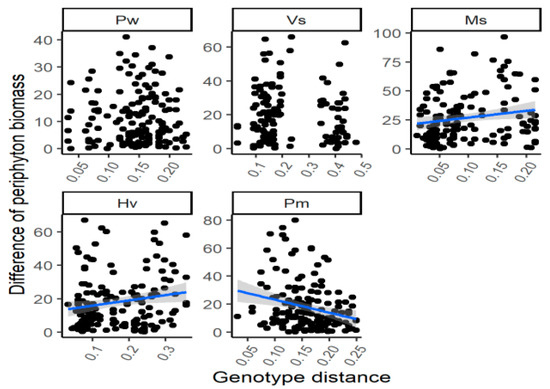 The correlations between the genetic distance and the differences of periphyton biomass of the individuals with different genotypes by the end of the experiment. For species name, Pw means Potamogeton wrightii; Vs means Vallisneria spinulosa; Ms means Myriophyllum spicatum; Hv means Hydrilla verticillata; Pm means P. macckianus.