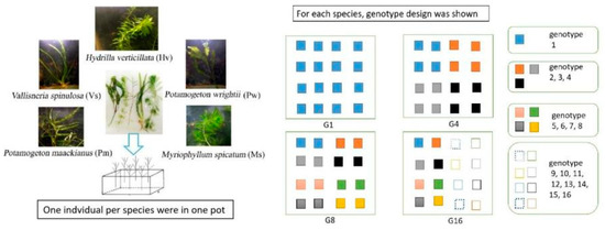 Four levels of genotype richness (1, 4, 8 and 16 genotypes) were constructed for each species. The genotypes appearing in treatments with low-level genotypes richness were nested in treatments with high levels of genotypes (e.g., all the four genotypes used in 4-genotype treatment were included in the 8-genotype treatment), and it referred to G1, G4, G8 and G16 hereafter (details shown in Figure 4). Each pond (size of length × width × height: 2 m × 2 m × 1 m) was planted with 80 individuals (ca. 10 cm length) in 16 plastic pots with an equally spaced 4 × 4 grid. Each pot (size of length × width × height: 40 cm × 30 cm × 15 cm) was filled with 10 cm depth of sediment, and cultivated with five individuals, with one for each species. For G1, 16 individuals from the same clone of each species were planted; for G4, 16 individuals with four genotypes (including the genotype used in G1) of each species were planted, and every four individuals shared one genotype; for G8, 16 individuals with eight genotypes (including the four genotypes used in G4) of each species were cultivated, and every two individuals shared one genotype; for G16, 16 individuals with 16 genotypes (including the eight genotypes used in G8) of each species were planted. Each genotype richness level consisted of five mesocosms as replicates. In summary, 1600 macrophyte individuals were transplanted and cultivated in 20 ponds.