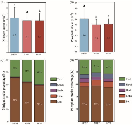 The stocks of N and P ranged from 5.7–6.2 t ha−1, and 0.5–0.6 t ha−1 in the three examined forests (Figure 1A,B). The MPNF stored a relatively high percentage of N in soil, while the MPPF and SPPF stored a high percentage of N in tree (Figure 1C,D). The stocks of N and P were similar in various tree organs (Table 3 and Table 4).