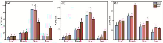 Overall, the C:N ratio was significantly different in root (p < 0.0001), marginally significantly different in stem (p = 0.047), but not different in leaf (p = 0.2016) and branch (p = 0.4354) in the studied forests (Figure 2A). Significant differences of the C:P and N:P ratios were found in branch (p = 0.008) and root (p = 0.0215), marginally in leaf (p = 0.08), but not in stem (p = 0.2519) (Figure 2B). The C:N ratio of stem was significantly higher in MPNF and MPPF than in SPPF, but C:P ratio in leaf and branch were lower in MPNF and MPPF than in SPPF. For root, the C:N and C:P ratios were significantly larger in SPPF than in other examined forest types. The SPPF had a significantly higher N:P ratio in all tree organs than those for MPNF and MPPF, expect in root where MPPF had the higher N:P ratio compared to that of SPPF (Figure 2C).