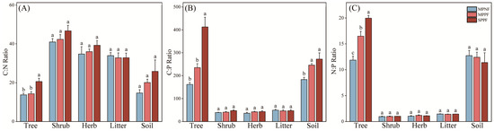 There were no significant differences of C:N, C:P, and N:P ratios (p > 0.05) in shrub, herb, and litter layers in the three forest types (Figure 3). Significantly statistical differences of C:N, C:P, and N:P ratios were found in tree among the three forest types (p < 0.05) (Figure 3), with a decreasing order of SPPF > MPPF > MPNF. Significantly statistical differences of C:P ratios were found in soil among the three forest types (p < 0.05), with a decreasing order of SPPF > MPPF > MPNF (Figure 3B). The C:N ratio ranged from 14–25 in soil of the three forest types and was higher in the root organ and tree component of the SPPF.