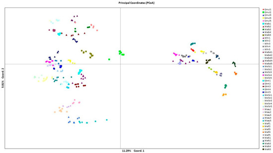 AMOVA was applied with 999 permutations to assess genetic differentiation among populations [49,50]. Gene flow (Nm) was calculated via the private allele method [51]. The analysis of heterozygosity (Ho), the expected heterozygosity (He) under Hardy–Weinberg equilibrium, and Wright’s fixation index (F = 1 − Ho/He) were tested for each locus in each population to test deviations from the Hardy–Weinberg equilibrium and thereby determine inbreeding in existing populations of C. gileadensis. Principal coordinate analysis (PCoA) was performed using GenAlEx 6.5 [45] based on pairwise genetic distance data among 600 individual genotypes belonging to 50 studied populations.