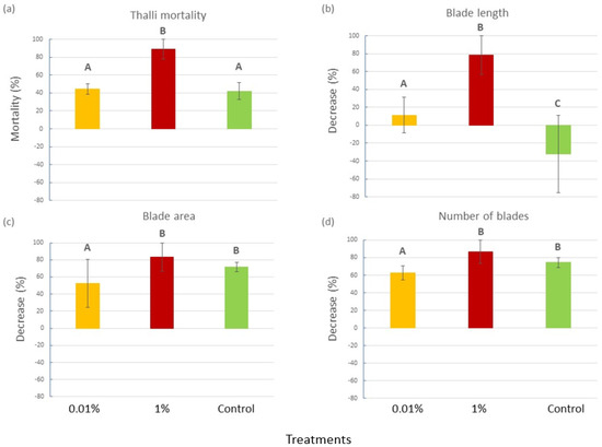 (a) Thalli mortality (mean percentage ± SE), (b) decrease in blade length (mean percentage ± SE), (c) blade area (mean percentage ± SE) and (d) blade number (±SE) for each experimental treatment (0.01% v/v diesel, 1% v/v diesel and Control with no diesel). Upper case letters indicate statistically significant differences between treatments (P < 0.05).