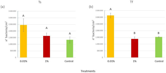 (a) Mean (±SE) epiphytic bacteria abundances (expressed as number of bacteria/cm2) for the three treatments (0.01% v/v diesel; 1% v/v diesel; Control with no diesel) at the beginning of the experiment (Ts); (b) mean (±SE) epiphytic bacteria abundances (expressed as number of bacteria/cm2) for the three treatments (0.01% v/v diesel; 1% v/v diesel; Control with no diesel) at the end (Tf) of the experiment. Upper case letters were used to indicate statistically significant differences between the treatments at Ts and Tf (P < 0.05).