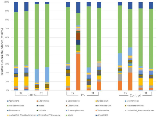Main genera forming the epiphytic bacterial communities of C. prolifera at the beginning (Ts) and at the end (Tf) of the experiment for each treatment (0.01% v/v diesel, 1% v/v diesel, Control with no diesel). Each genus is expressed as relative abundance (%) of the total genera in the sample. Genera whose abundance was <1% were grouped in “others”.