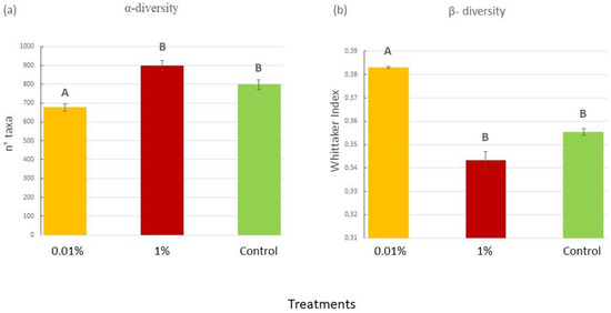 At the beginning of the experiment, the OTU richness index did not differ among treatments (P = 0.055). By the end of the experiment, however, the ANOVA highlighted a statistically significant difference between treatments (Figure 4a; P = 0.0494). In particular, the 0.01% treatment showed the lowest number of OTUs in comparison with the other treatments (Table S4 in Supplementary Materials). The Whittaker index, used as a measure of β-diversity between samples, did not differ among treatments at the start of the experiment (Table S5 in the Supplementary Materials), but, by the end, it significantly increased in the 0.01% samples if compared to the other treatments (P = 0.0066), as shown in Figure 4b and in Table S5 of the Supplementary Materials.