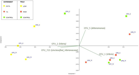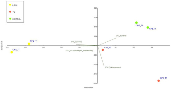 The PCA (Figure 5) showed that samples at Tf clustered in two groups: the 0.01% were spatially disposed on one side of the first principal component (PC1) while all the other samples lay on the opposite side. Figure 5 also reports the principal bacterial OTUs that contribute to the observed patterns. The trend highlighted by the PCA was confirmed also by the PERMANOVA, which gave no significant results for Ts (data not included in the biplot) while highlighting the significance of differences observed at Tf (P = 0.021) (Figure 5 and Table S10 in the Supplementary Materials). The SIMPLER post hoc test helped to define the relative contribution of different OTUs to the dissimilarities observed at Tf. In particular, the comparison between the 0.01 and the 1% samples showed an average dissimilarity of 43.47%, and the OTUs that mostly contributed to this dissimilarity were OTU_1 (Vibrio) (4.97%), OTU_2 (Vibrio) (4.62%), OTU_723 (Unclassified_Vibrionaceae) (3.77%) and OTU 5 (Alteromonas) (2.04%). Comparing the 0.01% and Control samples, the average dissimilarity was, instead, 47.48%, and it appeared to be mostly caused, once again, by OTU_1 (Vibrio) (4.82%), OTU_2 (Vibrio) (4.59%), OUT_723 (Unclassified_Vibrionaceae) (4.06%) and OTU_3 (Epibacterium) (2.31%). Lastly, the 1%–Control sample comparison showed an average dissimilarity of 27.32%, mostly caused by OUT_3 (Epibacterium) (1.97%), OTU_723 (Unclassified_Vibrionaceae) (1.78%), Vibrio2 OTU_1 (Vibrio) (1.75%) and OUT_5 (Alteromonas) (1.64%).