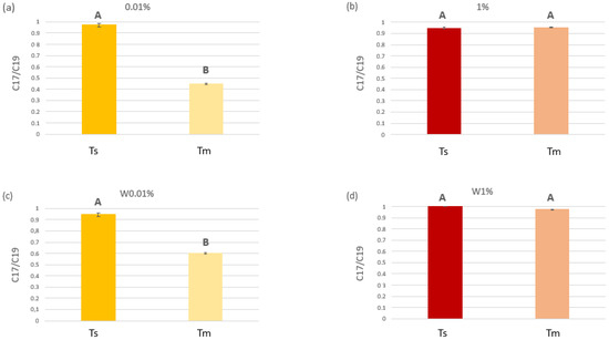 C17/C19 ratios measured at the beginning (Ts) and at the middle of the experiment (Tm). (a) and (b) refers to tanks with 0.01% and 1% v/v diesel, respectively, where C. prolifera was present. (c) and (d) refers to control tanks with 0.01% and 1% v/v diesel, respectively, where C. prolifera was missing. Upper case letters indicate the results of the t-test (P < 0.05) performed to check for statistical differences in diesel concentrations at the beginning (Ts) and at the middle (Tm) of the experiment, for each treatment (the two diesel concentrations and the presence/absence of the algae).