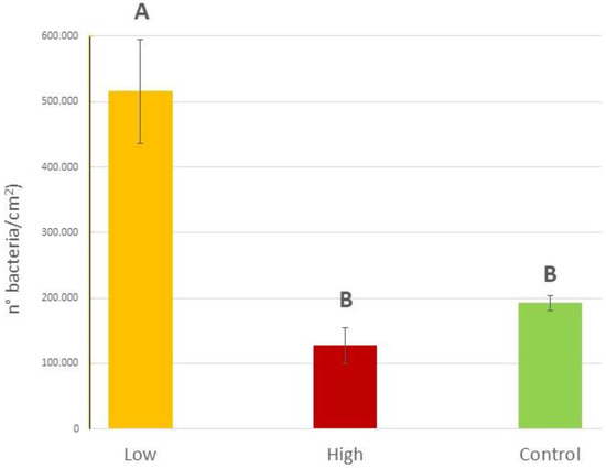 Epiphytic bacteria abundances (expressed as number of bacteria/cm2) on C. prolifera thalli collected in the field at the three different sites with different diesel concentrations (low: 84.38 mg L−1, high 730.57 mg L−1 and a Control: 31.99 mg L−1). Upper case letters indicate statistically significant differences between field samples (P < 0.01).