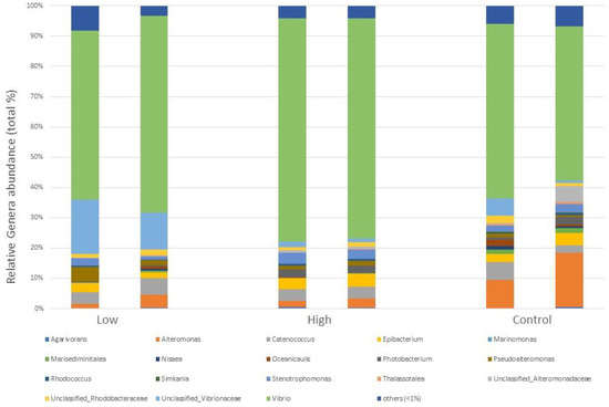 Main genera forming the epiphytic bacterial communities of C. prolifera collected in the field in three different locations, corresponding to different hydrocarbon (oil) contamination levels (low: 84.38 mg L−1, high 730.57 mg L−1 and a Control: 31.99 mg L−1). Each genus is expressed as relative abundance (%) of the total genera in the sample. Genera whose abundance was <1% were grouped in “others”.