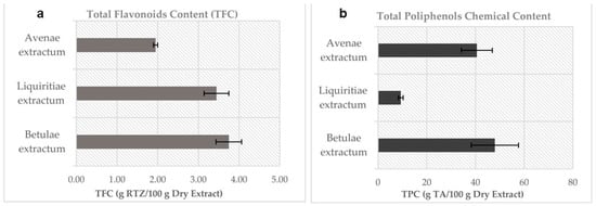 Chemical content in plant dry extracts: (a). TFC by CH3COONa-AlCl3 assay and (b). TPC by the Folin-Ciocalteu assay. (n = 5; error bars represent standard deviation).