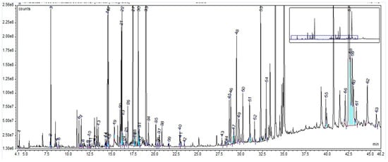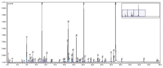The GC-MS chromatogram (Figure 2), resulting from the derivatization method applied to all three extracts, revealed, for the BE, a total of 63 phytochemical compounds (as trimethylsilyl (TMS) derivatives) grouped in nine classes (Supplementary Material Table S2), of which the main components are 3-epi-betulinaldehide (40.69%), D-glucopyranose (12.30%), D-mannose (4.16%), betulinaldehide (3.35%), and betulin (3.32%). The compounds, with their retention time and percentage area, are listed in Supplementary Materials Table S3.