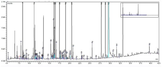 For AE, the GC-MS chromatogram highlighted a total of 57 compounds (as trimethylsilyl (TMS) derivatives) grouped in 10 classes (Supplementary Material Table S6). Their retention time and percentage area are listed in Supplementary Materials Table S6. The highest percentages were assigned to sucrose (28.03%), D-glucopyranose (12.62%), D-(−)-fructofuranose (16.34% isomer 1 + isomer 2), malic acid (9.62%), D-mannopyranose (6.09%), quininic acid (2.73%), lactic acid (1.35%), and linolenic acid (1.11%), as can be seen in Figure 4. The compounds, with their retention time and percentage area, are listed in Supplementary Materials Table S7.