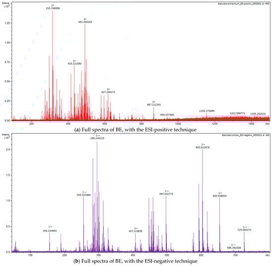 Full spectra of BE, with the ESI-positive (a) and negative (b) techniques.