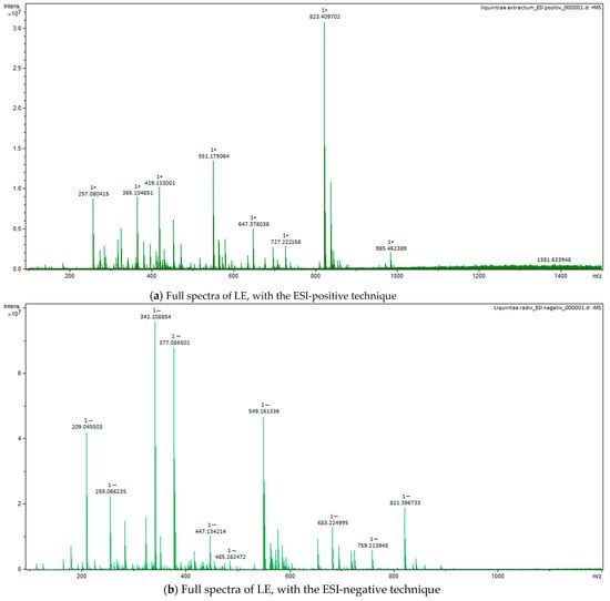 Figure 6. Full spectra of LE, with ESI-positive (a) and negative (b) techniques.