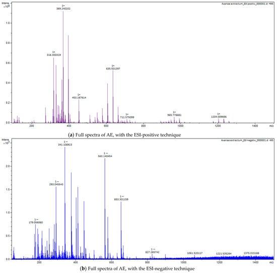 Full spectra of AE, with the ESI-positive (a) and negative (b) techniques.