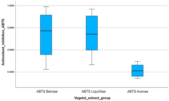 After comparing the multiple box plots for the ABTS antioxidant method applied to the three vegetal extracts, we can observe the following: the median inhibition of free radical reactivity ABTS per vegetal extract is highest for Betulae extractum (BE) and lowest for Avenae extractum (AE); the variation in the number of points scored per plant extract is highest for Betulae extractum (BE), which can be seen by how long the box plot is compared to Liquiritiae extractum (LE) and Avenae extractum (AE) (Figure 8); the vegetal extract with the highest antioxidant activity is Betulae extractum (BE), while the vegetal extract with the lowest antioxidant activity is Avenae extractum (AE).