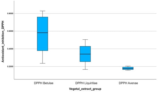 For the DPPH method, a test was performed to determine whether the difference between the groups occurred randomly or was statistically significant, and it was observed that there were statistically significant differences (p < 0.05) when comparing the antioxidant capacities of the studied plant extracts (One-Way ANOVA). Thus, after performing the Games–Howell post hoc test for unequal variances, it was found that there was a statistically significant difference between all the groups (Table 6): DPPH Betulae vs. DPPH Liquiritiae (p = 0.026, p < 0.05), DPPH Betulae vs. DPPH Avenae (p = 0.001, p < 0.05), and DPPH Liquiritiae vs. DPPH Avenae (p = 0.003, p < 0.05).