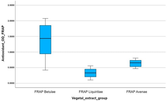 The comparative analysis of the multiple box plots for the FRAP antioxidant capacity of the vegetal extracts highlights the superior antioxidant potency of silver birch extract, in contrast to the other analyzed extracts (Figure 10). Using the FRAP assay, we obtain the lowest colorimetric reaction, in terms of obtained optical density, for licorice. The slightly different results compared to those obtained by the other two antioxidant methods can be explained by the different behavior of the tested plant extracts compared to the physiologically reactive species (ferric and ferrous ions), unlike the interaction of the extracts with non-physiological free radicals (ABTS and DPPH).