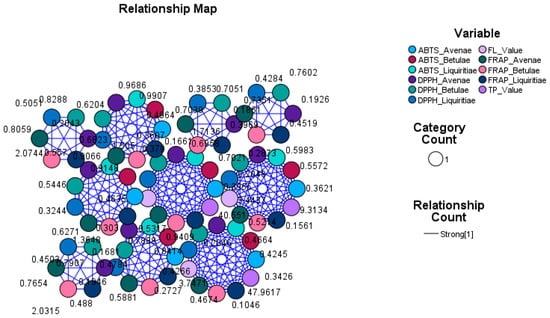 In the relationship map, which represents the connections between different antioxidant methods (ABTS, DPPH, and FRAP) applied to the three vegetal extract groups (Betulae extractum, Liquiritiae extractum, and Avenae extractum) and the concentration of bioactive compounds (total polyphenols and flavones), we can observe the thickness of each link that represents the strength of the relationship (so, the thicker the link line is, the stronger the relationship), but there are also visible the nodes for each variable (the bigger the nodes, the more influence as there are more cases related to that node) (Figure 11). A symmetry of the size of the nodes was obtained for all the tested variables and a uniformity of the connections, which highlights a strong relationship confirmed by using this graphic tool.
