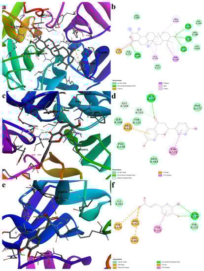 Liquiritigenin and caffeic acid showed preferential binding to the same sub-pocket that the positive control occupies. Moreover, liquiritigenin is a flavone that shares the same structural scaffold as chromone-2-carboxylic acid (the benzopyran-4-one substructure), and it had a binding energy of −7.226 kcal/mol. The ligand formed four polar interactions: a conventional hydrogen bond with Ala556, two carbon-hydrogen bonds with Gly509 and Ser555, and a pi–cation interaction with Arg415. Moreover, a stacked pi interaction was formed with Tyr572, and van der Waals interactions were formed with five other residues (Figure 12c,d).