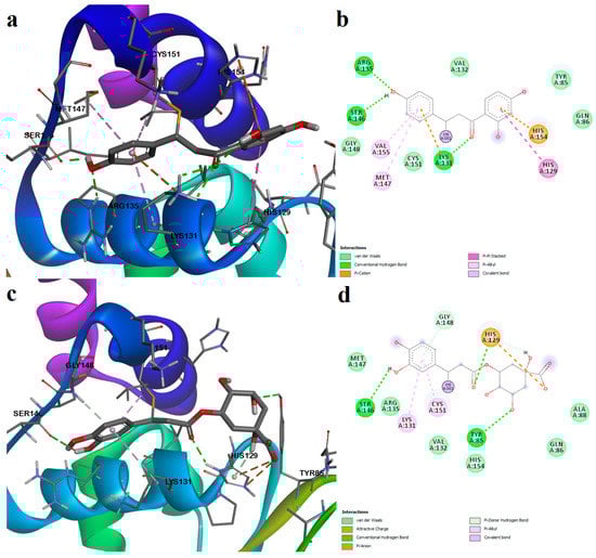 Predicted protein–ligand complexes after covalent docking with Cys151 (Keap1 BTB domain). (a)—binding pose of isoliquiritigenin; (b)—two-dimensional depiction of protein–ligand interactions between Keap1 and isoliquiritigenin; (c)—binding pose of chlorogenic acid; (d)—two-dimensional depiction of protein–ligand interactions between Keap1 and chlorogenic acid.