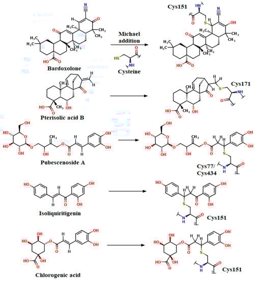 Since there are no solved complex structures for ligands that covalently bind reactive residues Cys77, Cys171, and Cys434, we docked the known ligands, and the generated models were validated by analyzing the predicted poses. For Cys171 (BTB domain), we docked the confirmed ligand pterisolic acid B as a positive control (Supplementary Material Figure S54d). Pterisolic acid had three unsatisfied hydrogen bond acceptor atoms (the unsaturated ketone and carboxylic acid moiety), but it formed two hydrogen bonds through the hydroxyl moiety. The predicted pose had a binding energy of −13.450 for Cys171, and the binding affinities for the other cysteines were practically lower. For Cys77 (BTB domain) and Cys434 (Kelch domain), we chose pubescenoside A as a positive control and known ligand. The binding mode of pubescenoside (Supplementary Material Figure S54c,e) was considered valid when it formed similar interactions as those described by the paper that identified it as a ligand []. Pubescenoside showed a binding energy of −17.790 kcal/mol for Cys77, and the binding affinity was similar for Cys171. However, the ligand conformation after binding to Cys171 was too strained to be considered plausible. Moreover, pubescenoside showed a better binding affinity for Cys434 than for Cys151.