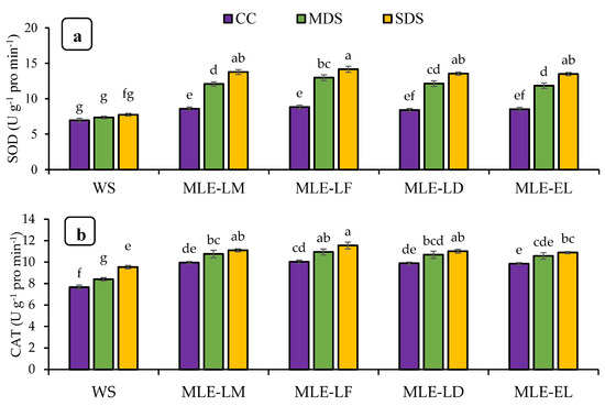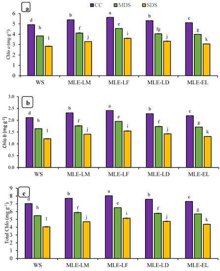 The effects of foliar treatments with MLE regarding chlorophyll contents and carotenoids are shown in Figure 2. Significant differences were observed in chlorophyll contents and carotenoids in response to drought stress treatments. In addition, MLE of local landraces was more effective than exotic landraces regarding chlorophyll contents and carotenoids. The interaction of both factors, MLE and drought, was also observed as statistically significant. Maximum improvement in chlorophyll contents and carotenoids was regarded after the application of MLE-LF under CC while maximum reduction was found under severe stress conditions with water spray (Figure 2a–d). MLE treatments were also observed to be effective under MDS and SDS.