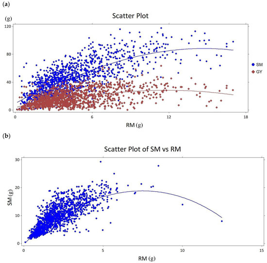 Scatter plots for the combined data of root biomass (RM; g) and shoot biomass (SM; g), and grain yield (GY; g) in various experiments conducted at the University of California, Riverside. Each point represents a single plant from experiments carried to; (a) maturity, (b) for 40 to 70 days, and (c) for 21 to 28 days. Plot a shows the relationship between the root mass and the shoot mass or grain yield (GY); plots b and c show the relationships between the root mass (RM) and the shoot mass (SM). Note that plots are on different scales (Loess α = 0.75).