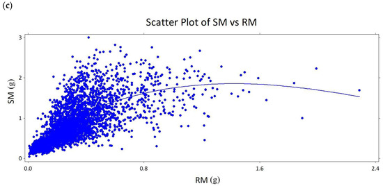 The main objective here was to perform a meta-analysis of combined data from a series of previous experiments. Those experiments, conducted with diverse sets of wild and domesticated accessions from the Triticeae tribe, offered a wide window of root and shoot biomass variation measured between 21 days after planting to maturity. A total of 6353 data points were assembled to create the scatter plots for the relationship between the root and shoot biomass (Figure 1). The data from the previous experiments that were continued for 21–28 days, 40 to 70 days, and until maturity were analyzed as separate groups to obtain ranges in SM and RM. The first set included 1243 data points (Figure 1a) from experiments where plants were grown to maturity. The second and third sets had 1342 (40–70 days) and 3768 points (21–28 days) (Figure 1b,c), respectively. These experiments were concluded before maturity, with only the shoot and root biomass collected (Table 1). As previously reported in our publications [13,14,52,53,54,55,56], each set had significant genetic diversity for all evaluated traits. Here, two traits of interest are given in a summary table (Table 2). Shoot biomass for 21–28 days, 40–70 days, and maturity experiments ranged between 0.05–3.00 g, 1.54–70.19 g, and 44.07–117.11 g, respectively. Similarly, the root biomass for the same experiments ranged between 0.01–2.29 g, 0.27–12.49 g, and 3.96–17.68 g, respectively. Overall, there was a strong correlation between the root and shoot biomass in all experiments. Each experiment was conducted until a certain phenological stage, e.g., booting and anthesis. A total of 6353 data points from the entire set of accessions (639 accessions including checks) were used for the correlation analyses and similar trendlines were obtained in all (Figure 1a–c). All three data sets clearly demonstrate a proportional increase in root and shoot biomass early on, and a gradual reduction in the shoot biomass increases (including grain yield, Figure 1a) as the root biomass increases. In each scenario, there appears to be a point where additional increases in root biomass negatively affect shoot biomass. Following this trendline, a set of preliminary validation experiments are designed to observe drought-related changes and trade-offs in root–shoot biomass allocation patterns.